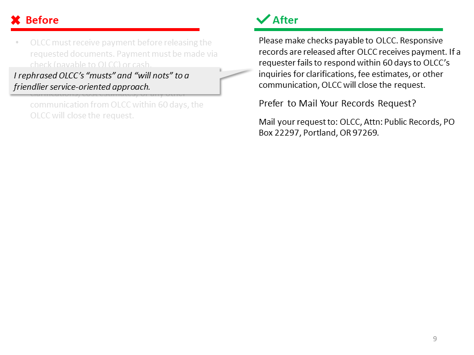 Public Records Request RewriteBefore and After Slide 1 Slide 1 (current slide) Slide 2 Slide 2 (current slide) Slide 3 Slide 3 (current slide) Slide 4 Slide 4 (current slide) Slide 5 Slide 5 (current slide) Slide 6 Slide 6 (current slide) Slide 7 Slide 7 (current slide) Slide 8 Slide 8 (current slide) Slide 9 Slide 9 (current slide)